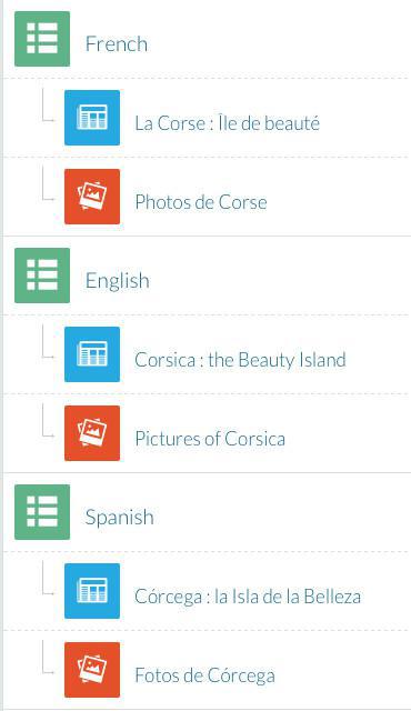 Se pueden crear diferentes secciones de contenido en cada uno de los diferentes idiomas y reagruparlos bajo una sección de menú, como en el ejemplo que se muestra a continuación (para más información sobre la sección Menú consulte esta ayuda en línea).